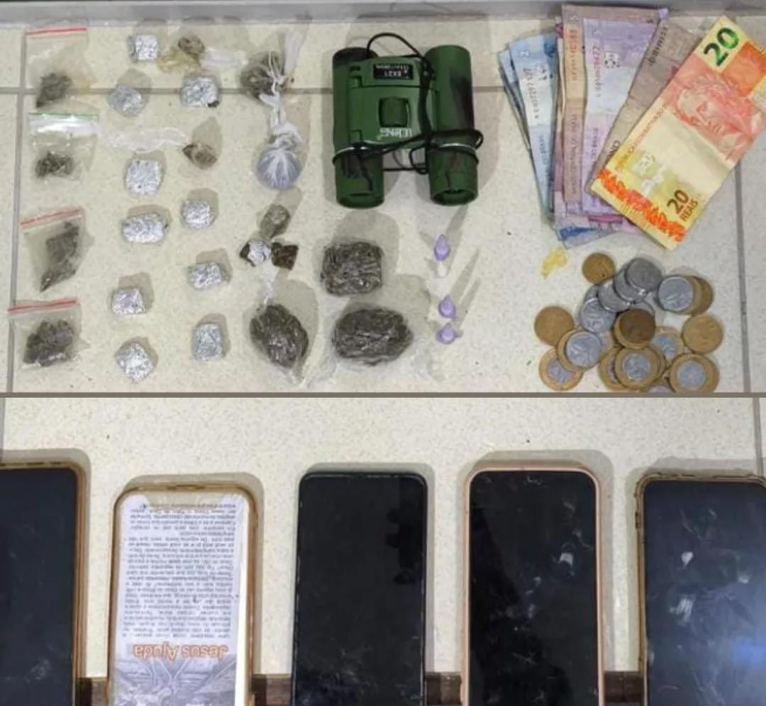 Ao chegarem ao imóvel indicado, outro homem pulou o muro e fugiu. Diante da situação, os policiais entraram na residência. No quarto identificado pelo suspeito como sendo o seu, a guarnição encontrou uma pochete com drogas, dinheiro, documentos pessoais e outros materiais. O abordado afirmou que o homem que fugiu, identificado como Isac, traficava drogas com ele no local.