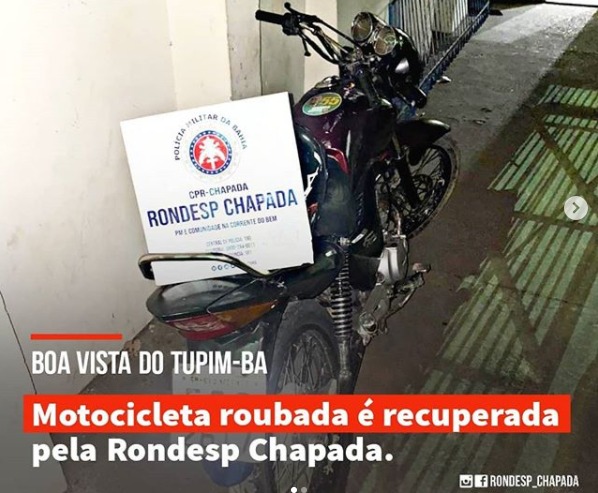 Motocicleta roubada é recuperada pela Rondesp Chapada em Boa Vista do Tupim.