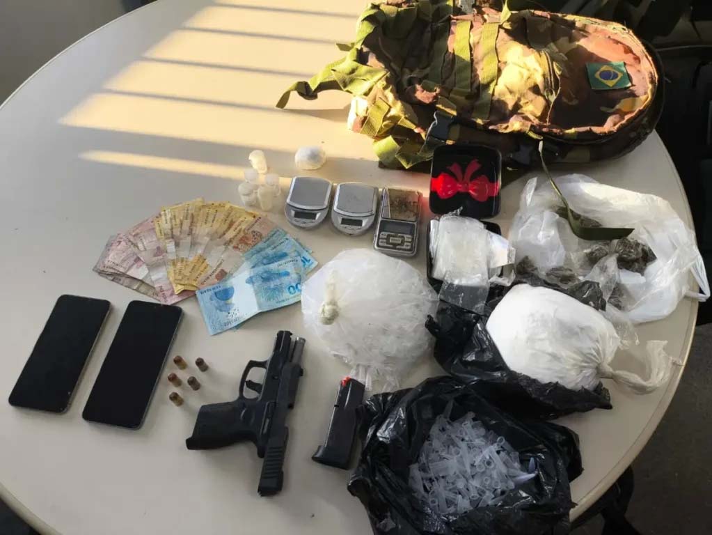 Com ele, a polícia encontrou uma pistola calibre .40 da marca Taurus, munições, dois celulares — um Redmi azul e um iPhone rosa —, cerca de R$ 600 em dinheiro e porções de drogas. Todo o material apreendido foi encaminhado à delegacia para os procedimentos legais.