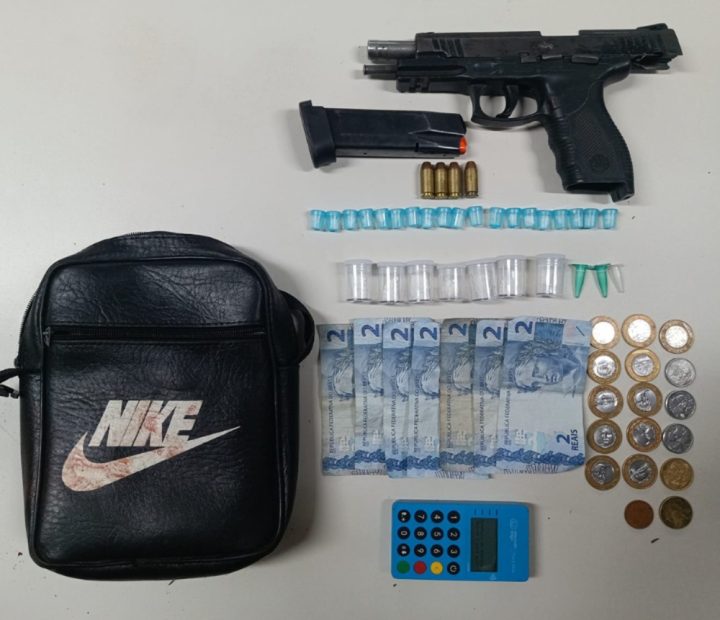 Na ação, foram apreendidos uma pistola calibre .40, com carregador e munições, 26 potes de diversos tamanhos contendo cocaína, além de três pinos da droga, uma máquina de cartão bancário e dinheiro. O valor não foi detalhado.