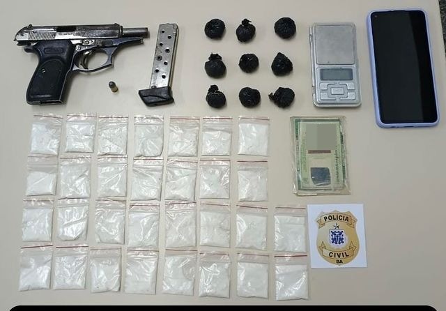Na ação, os policiais apreenderam uma Pistola Calibre .380, nove Buchas de substância análoga a maconha uma balança precisão, 31 porções de substâncias análogas a cocaína, 01 aparelho celular marca Xaomi e um documento de identidade. O material apreendido foi apresentado na Delegacia Territorial de Ruy Barbasa.