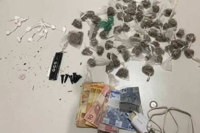 De imediato a guarnição procedeu com o acompanhamento e após alcançar o indivíduo, procederam com a busca pessoal, sendo encontrado na mochila do mesmo, 06 pinos de plástico, 12 trouxinhas de substância análoga a cocaína, 63 trouxinhas de substância análoga a maconha, R$ 249 em dinheiro e 01 carregador de celular.