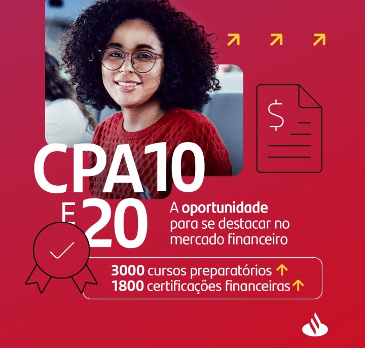 O Santander Brasil, em parceria com a Academia de Finanças Rafael Toro, oferece 3 mil bolsas para cursos preparatórios para as certificações CPA-10 e CPA-20, credenciais mínimas para trabalhar no mercado de investimentos e produtos financeiros, ambas concedidas pela Anbima (Associação Brasileira das Entidades dos Mercados Financeiro e de Capitais).