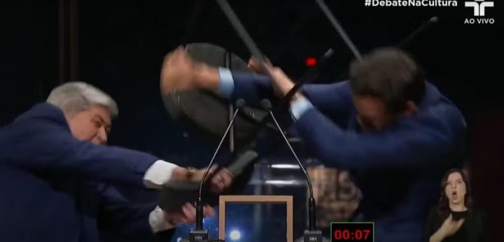 Na sequência, Datena aparece na imagem agredindo Pablo Marçal com o que aparenta ser uma cadeira.