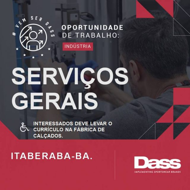 O Grupo Dass está com vaga disponível para a área Serviços Gerais, na Fábrica de Calçados de Itaberaba.