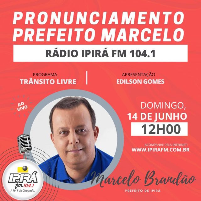 Prefeito de Ipirá, Marcelo Brandão pode tomar medidas drásticas para conter o aumento de casos de Covid19 O Prefeito de Ipirá, Marcelo Brandão faz um pronunciamento oficial, neste domingo (14) ás 12h, na rádio Ipirá FM, para falar sobre o Coronavírus e providências adotadas pelo Município O gestor está preocupado com o aumento repentino de casos de 07 para 30 em pouco tempo.