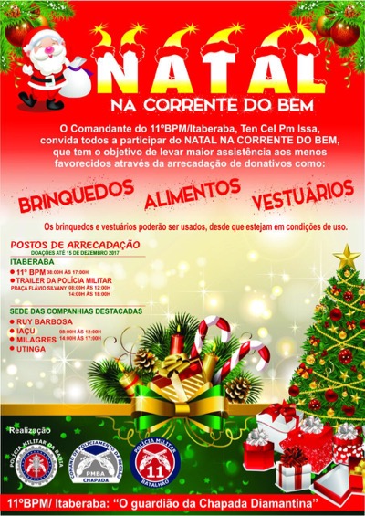 O Comandante do 11° BPM/Itaberaba, Ten Cel PM Issa, convida todos a participar do “Natal na Corrente do Bem”, que tem o objetivo de levar maior assistência aos menos favorecidos através da arrecadação de donativos ( alimentos, brinquedos e vestuários).