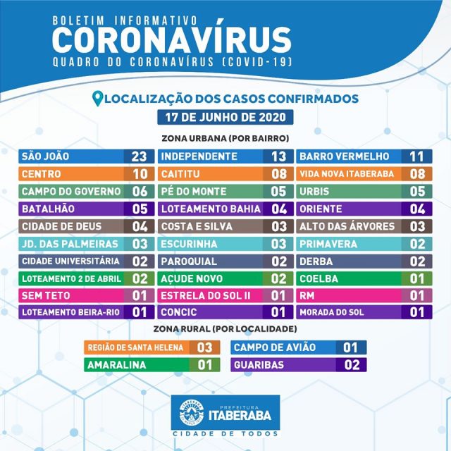 Pelo menos 143 pessoas ja se contaminaram pelo novo coronavírus na cidade de Itaberaba. As informações foram divulgadas pela Prefeitura no inicio da tarde desta quarta-feira (17) e de acordo com os novos dados, os casos já foram registrados em 30 bairros na cidade e em 4 localidades rurais.