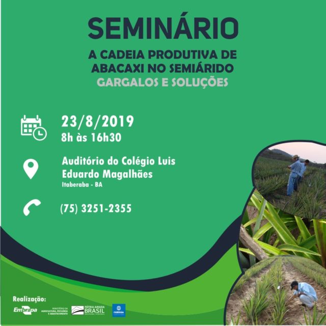 Nesta sexta, dia 23 de agosto, a Embrapa Mandioca e Fruticultura vai realizar, em parceria com a prefeitura de Itaberaba (BA), o seminário “A cadeia produtiva de abacaxi no semiárido – gargalos e soluções”. O evento, que tem como público-alvo agricultores, empresários rurais, professores, pesquisadores, estudantes, técnicos e outros agentes da cadeia produtiva de abacaxi, será no auditório do Colégio Luís Eduardo Magalhães.