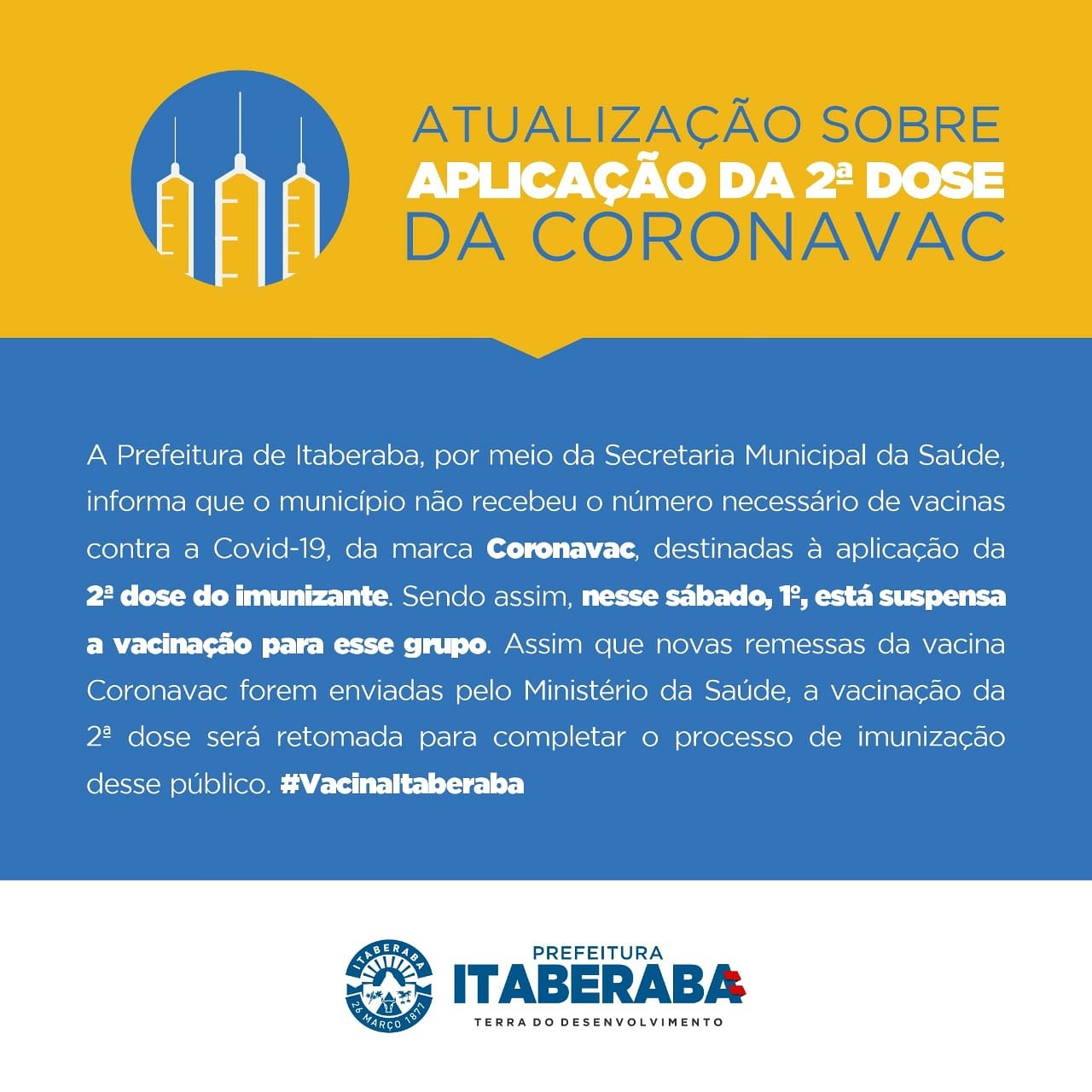 Prefeitura de Itaberaba suspende aplicação da 2º dose da vacina Coronavac neste sábado (01).