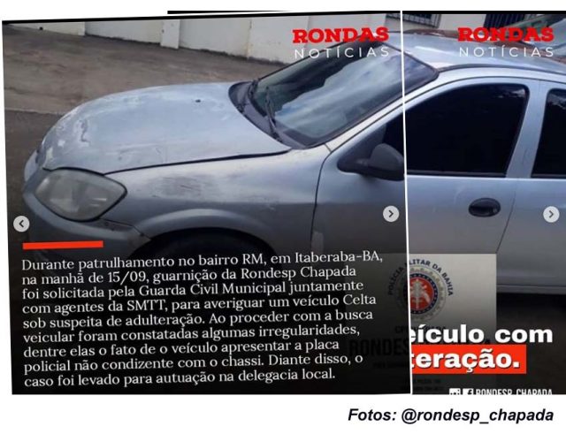 Durante patrulhamento no bairro RM, em Itaberaba-BA, na manhã de 15/09, guarnição da Rondesp Chapada foi solicitada pela Guarda Civil Municipal juntamente com agentes da SMTT, para averiguar um veículo Celta sob suspeita de adulteração.