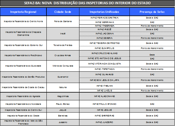 As novas unidades da Sefaz-Ba estão distribuídas regionalmente e cobrem toda a extensão territorial do Estado. Na Inspetoria Fazendária (Infaz) da Costa do Cacau, com sede em Itabuna, foi absorvida a antiga Infaz Ilhéus. Na Infaz da Chapada Diamantina, sediada em Irecê, estão unificadas duas: as de Jacobina e Seabra.