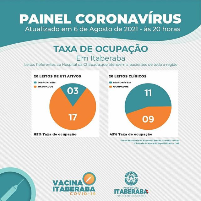De acordo com o boletim diário de sexta-feira (06) e do Estado da Bahia – SESAB, atualmente os números da taxa de ocupação de leitos no município são: 20 Leitos Clínicos, com 9 leitos ocupados, representando 45% de taxa de ocupação; 20 Leitos de Unidades de Terapia Intensiva – UTI, com 17 leitos ocupados, representando 85% de taxa de ocupação.