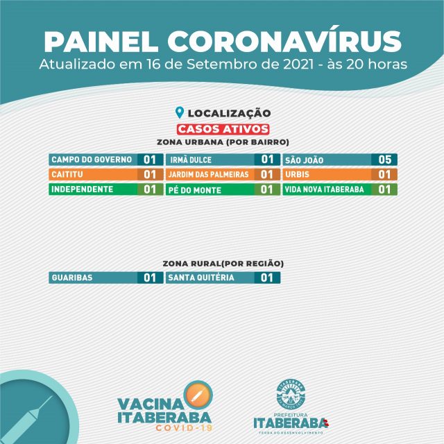 A Prefeitura de Itaberaba, por meio da Secretaria Municipal da Saúde, informa o boletim diário de quinta-feira (16) com dados consolidados até as 17h.