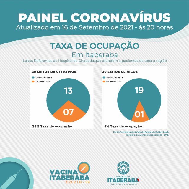 De acordo com o boletim diário de quinta-feira (16) e do Estado da Bahia – SESAB, atualmente os números da taxa de ocupação de leitos no município são: 20 Leitos Clínicos, 1 leito ocupado, representando 5% de taxa de ocupação; 20 Leitos de Unidades de Terapia Intensiva – UTI, com 7 leitos ocupados, representando 35% de taxa de ocupação.