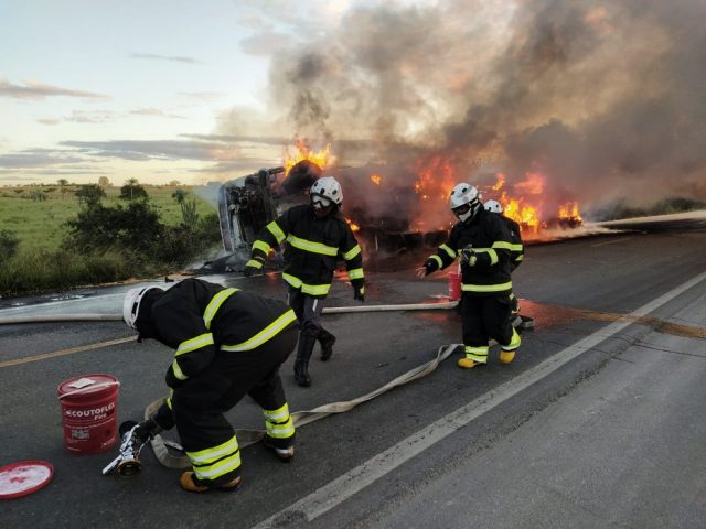 “Assim que recebemos o chamado, via 193, deslocamos o nosso caminhão auto bomba tanque (ABT) e uma ambulância, pois de acordo com o informe, o motorista da carreta apresentava escoriações e sentia dores no ombro”, contou o chefe da Seção de Planejamento Operacional do 11º GBM, capitão BM Márcio Roberto Jansen de Sá Teles.