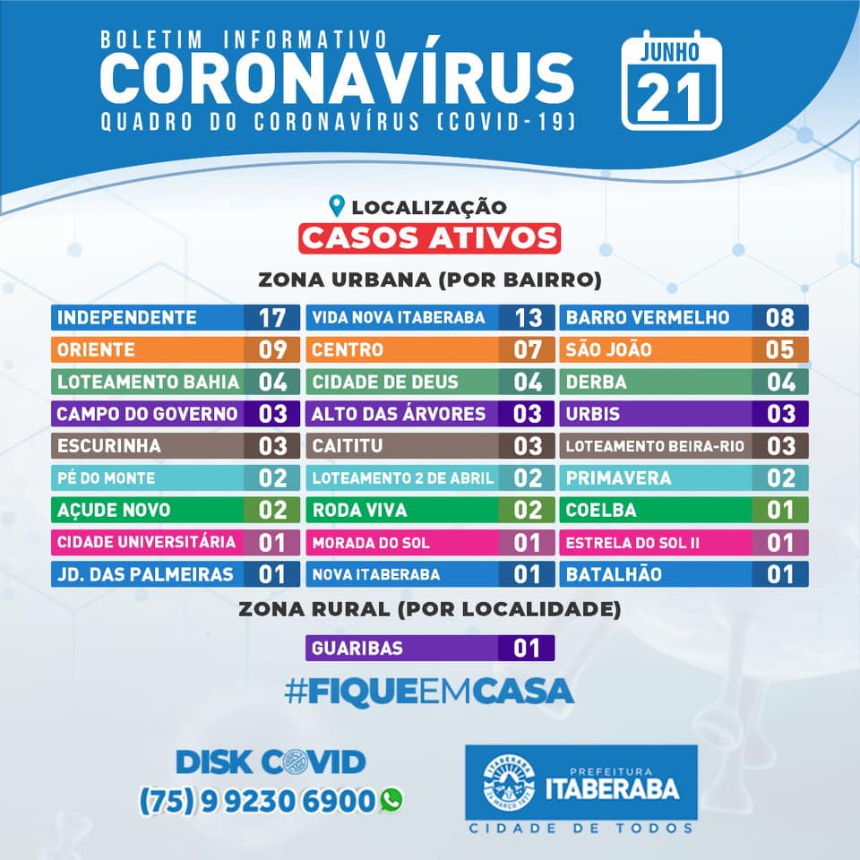 Em Itaberaba 27 bairros e 1 povoado tem registros de casos ativos. Não é possível saber a totalidade de bairros e localidades, onde já foram confirmados casos positivos por conta da nova modalidade adotada pela prefeitura em divulgar apenas casos ativos por localidade e bairros, prejudicando a transparência nestas informações.