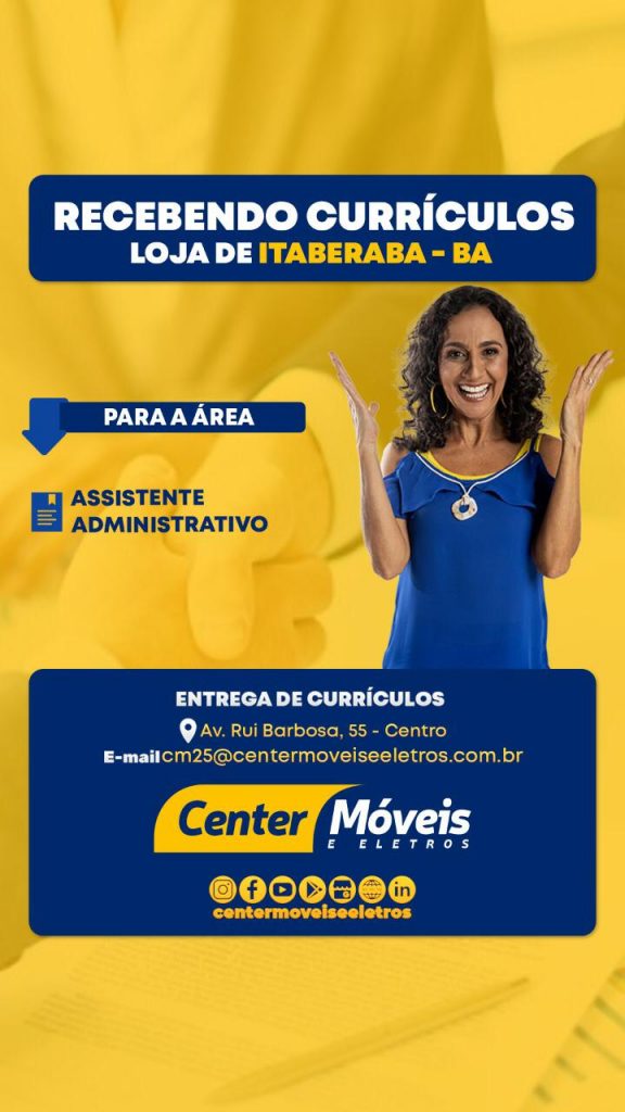 A oportunidade é para Assistente Administrativo. Os interessados podem entregar o currículo na loja, que fica localizada na Avenida Ruy Barbosa, 55, no Centro de Itaberaba.