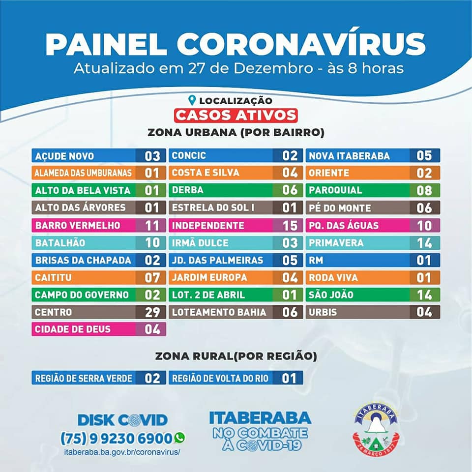 A cidade de Itaberaba está com 186 casos ativos de covid-19 em 31 bairros e 2 regiões da zona rural. Estas informações foram divulgadas, na manhã deste domingo (27) pela prefeitura.