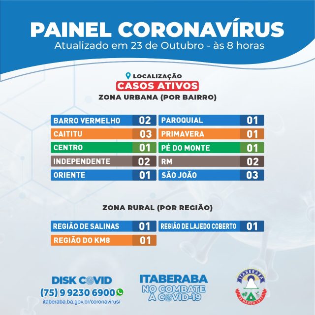 A Prefeitura de Itaberaba, por meio da Secretaria Municipal de Saúde (Sesau), assim como da Coordenação de Vigilância em Saúde e da Câmara Técnica (CT) de enfrentamento da pandemia do novo coronavírus, informa o Boletim Oficial 23/10 ㅡ com dados consolidados até às 17h de quinta-feira (22) ㅡ que registrou 2 novos casos da COVID-19.