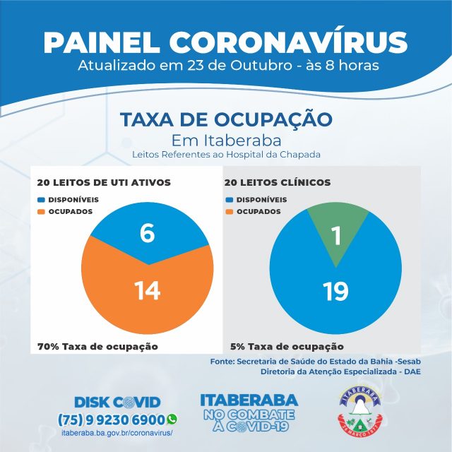 De acordo com o Boletim Oficial 23/10, até às 17h de quinta-feira (22), os números da Taxa de Ocupação de Leitos Clínicos e de Unidades de Terapia Intensiva (UTIs) no município, com dados da Secretaria da Saúde do Estado da Bahia (Sesab), são os seguintes: dos 20 LEITOS DE UTI ATIVOS, 17 estão ocupados; ao passo que, dos 20 LEITOS CLÍNICOS, nenhum está ocupado atualmente.