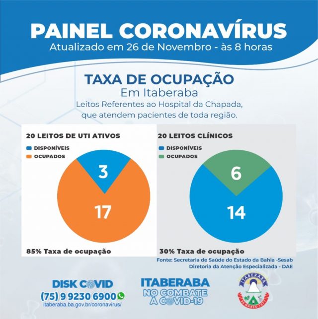 De acordo com o Boletim Oficial 26/11, até às 17h de quarta-feira (25), os números da Taxa de Ocupação de Leitos Clínicos e de Unidades de Terapia Intensiva (UTIs) no município, com dados da Secretaria da Saúde do Estado da Bahia (Sesab), são os seguintes: dos 20 LEITOS DE UTI ATIVOS, 17 estão ocupados; ao passo que, dos 20 LEITOS CLÍNICOS, 6 estão ocupados atualmente.