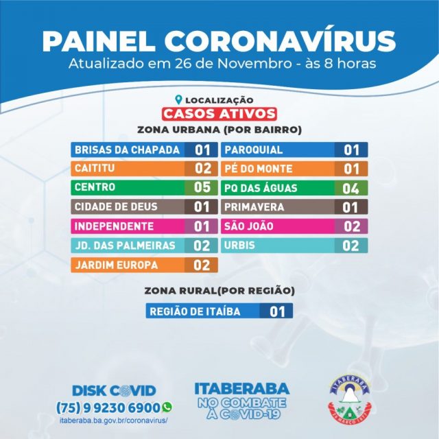 A Prefeitura de Itaberaba, por meio da Secretaria Municipal de Saúde (Sesau), assim como da Coordenação de Vigilância em Saúde e da Câmara Técnica (CT) de enfrentamento da pandemia do novo coronavírus, informa o Boletim Oficial 26/11 ㅡ com dados consolidados até às 17h de quarta-feira (25) ㅡ que registrou 9 novos casos da COVID-19.
