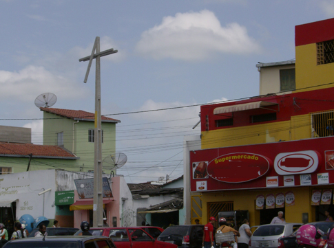 Um risco para quem passa pela praça do coqueiro. Uma cruzeta de concreto de aproximadamente 50Kg está pendurada em um poste próximo aos supermercados mais movimentados da praça do coqueiro. Centenas de pessoas trafegam pelo local diariamente.