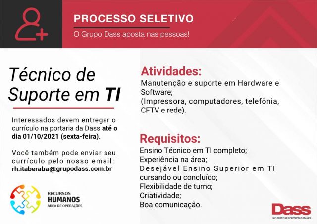Dass está recebendo currículos para Técnico de Suporte em TI, em Itaberaba