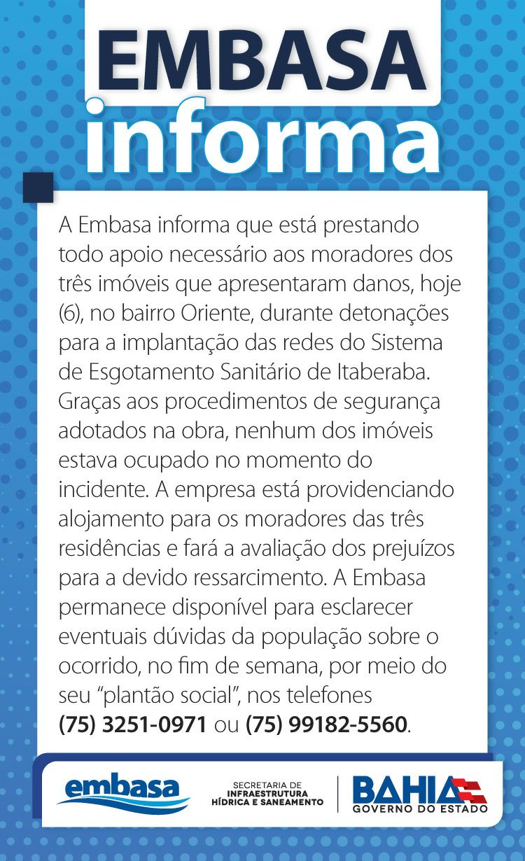 Em nota enviada ao site Itaberaba Notícias, a Embasa informou que, devido aos procedimentos de segurança, no momento da detonação, nenhum dos moradores estavam nos imóveis, e que já adotou providencias para alojamento das famílias desabrigadas e avaliação dos prejuízos para ressarcimento.