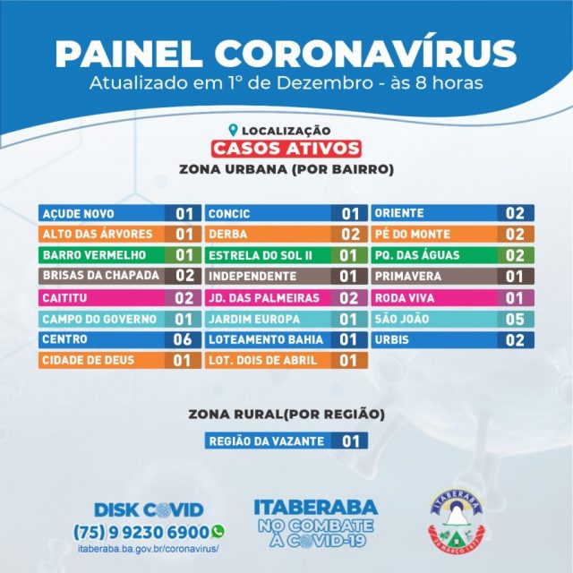 A Prefeitura de Itaberaba, por meio da Secretaria Municipal de Saúde (Sesau), assim como da Coordenação de Vigilância em Saúde e da Câmara Técnica (CT) de enfrentamento da pandemia do novo coronavírus, informa o Boletim Oficial 01/12 ㅡ com dados consolidados até às 17h de segunda-feira (30) ㅡ que registrou 8 novos casos da COVID-19.