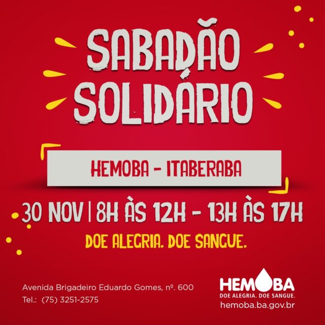 Em comemoração ao Dia Nacional do Doador de Sangue, a Unidade de Coleta e Transfusão (UCT) de Itaberaba, ligada à Fundação Hemoba, realiza, no próximo sábado (30) — de 8h às 12h e das 13h às 17h — mais um Sabadão Solidário com a finalidade de aumentar os estoques da Unidade que, com a chegada do final de ano, precisam estar devidamente abastecidos nesta época.