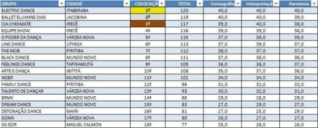 Na soma da pontuação, o grupo da cidade de Itaberaba-BA, Electric Dance, se consagrou campeão do II Festival Regional de Dança em Piritiba-BA. A equipe obteve 120 pontos, conquistou pela segunda vez o título na “Cidade Alegria” e faturou a premiação de R$ 2.000,00. O Ballet Eluanne Dias (Jacobina) terminou na segunda colocação com 119 pontos, o grupo conquistou o prêmio de R$ 1.000,00. Em terceiro lugar com 117 pontos, Companhia Chekmate (Irecê), a equipe recebeu o valor de R$ 500,00.