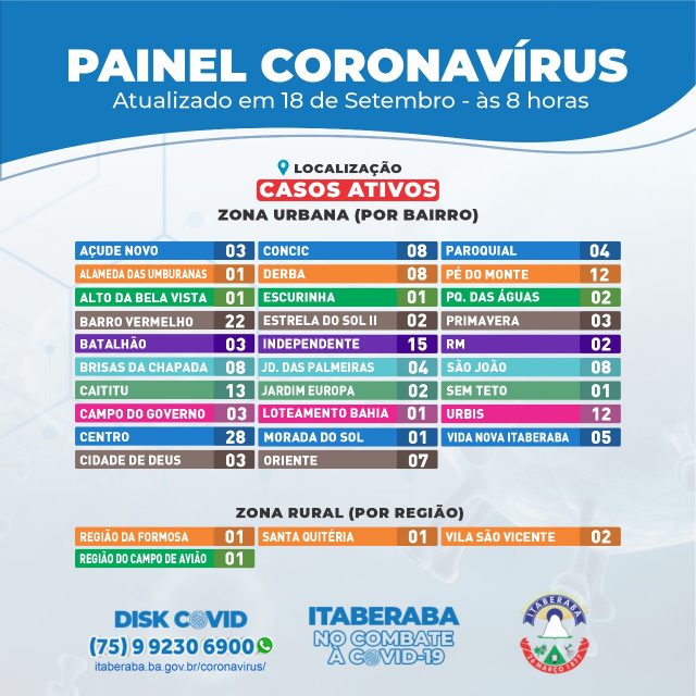 A Prefeitura de Itaberaba, por meio da Secretaria Municipal de Saúde (Sesau), assim como da Coordenação de Vigilância em Saúde e da Câmara Técnica (CT) de enfrentamento da pandemia do novo coronavírus, informa o Boletim Oficial 18/09 ㅡ com dados consolidados até às 17h de quinta-feira (17) ㅡ que registrou 10 novos casos da COVID-19.