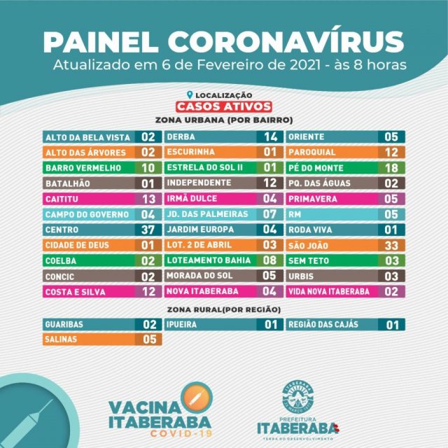 A Prefeitura de Itaberaba, por meio da Secretaria Municipal de Saúde (Sesau), assim como da Coordenação de Vigilância em Saúde e da Câmara Técnica (CT) de enfrentamento da pandemia do novo coronavírus, informa o Boletim Oficial 06/02 ㅡ com dados consolidados até às 17h de sexta-feira (05) ㅡ que registrou 4 novos casos da COVID-19.