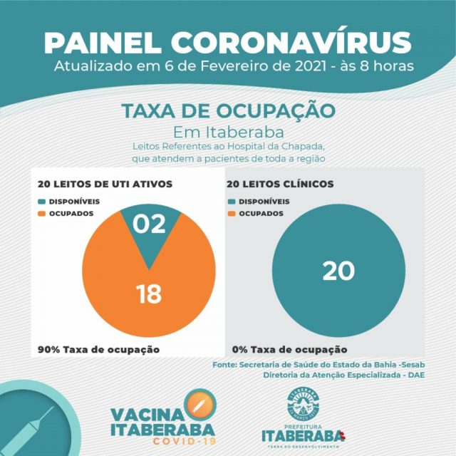 De acordo com o Boletim Oficial 06/02, até às 17h de sexta-feira (05), os números da Taxa de Ocupação de Leitos Clínicos e de Unidades de Terapia Intensiva (UTIs) no município, com dados da Secretaria da Saúde do Estado da Bahia (Sesab), são os seguintes: dos 20 LEITOS DE UTI ATIVOS, 18 estão ocupados; ao passo que, dos 20 LEITOS CLÍNICOS, nenhum está ocupado atualmente.