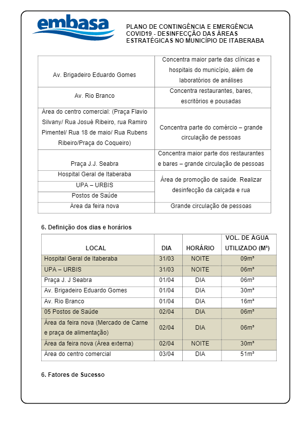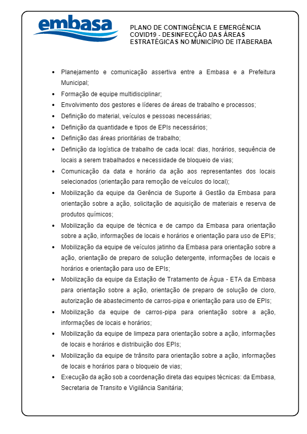 Adotando mais medidas de combate à propagação do coronavirus, e potencializando a força das parcerias institucionais, a Embasa e a Prefeitura se uniram para mais uma ação de enfrentamento à Covid19. Caminhões pipas e 6 funcionários da Secretaria de Infraestrutura abastecem nas dependências da Embasa os carros com uma mistura de água, sabão e água sanitária, e seguem para higienização.