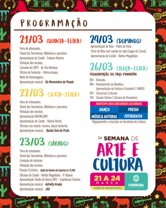 A 9ª Semana de Arte e Cultura, começa hoje e vai até  dia 24 de março em comemoração aos 142 anos de emancipação politica de Itaberaba. Confira a programação: