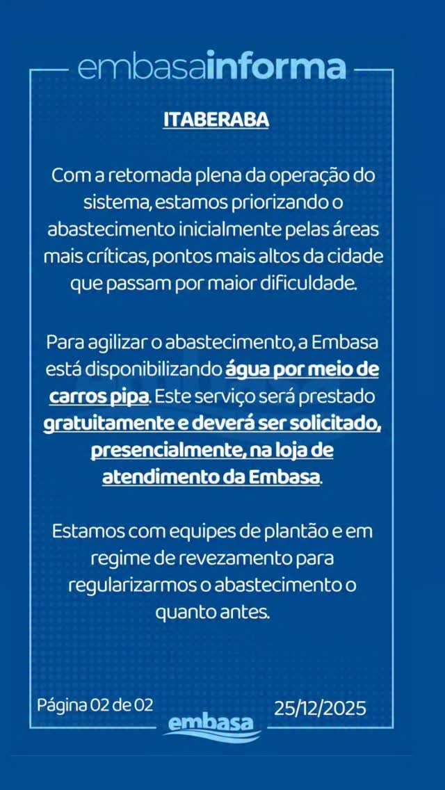 Segundo a empresa, com a retomada plena da operação do Sistema Integrado de Itaberaba, o abastecimento está sendo restabelecido de forma gradual e priorizada, atendendo inicialmente os pontos mais críticos e os bairros mais altos, que tradicionalmente enfrentam maior dificuldade de pressão na rede.