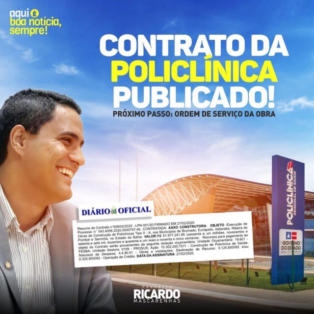 “A gente já começa a segunda-feira do mês de março assim, com boa notícia! A nossa policlínica da chapada já foi licitada e melhor governador do Brasil, @ruicostaoficial, vai dar a ordem de serviço em breve!” – disse Ricardo.