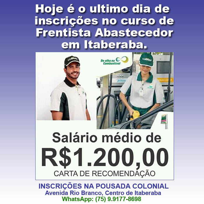 Termina hoje, o prazo de inscrições no curso de Frentista Abastecedor em Itaberaba. Restam pouquíssimas vagas.