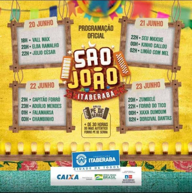 O São João de Itaberaba, que acontece entre os dias 20 e 23 de junho com as atrações: Vall Max, Elba Ramalho, Júlio Cesar, Capitão Forró, Aduílio Mendes, Falamansa, Chambinho, Seu Maxixe, Kinho Callou, Limão com Mel, Zumbelê, Forró do Tico, Xaxa Dumdum, Dorgival Dantas e outras atrações locais não divulgadas pela prefeitura.