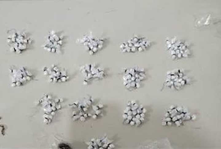 Durante a abordagem e revista pessoal, os agentes encontraram com o suspeito 148 porções de uma substância análoga à cocaína, uma bucha de maconha e materiais utilizados para embalar drogas ilícitas.