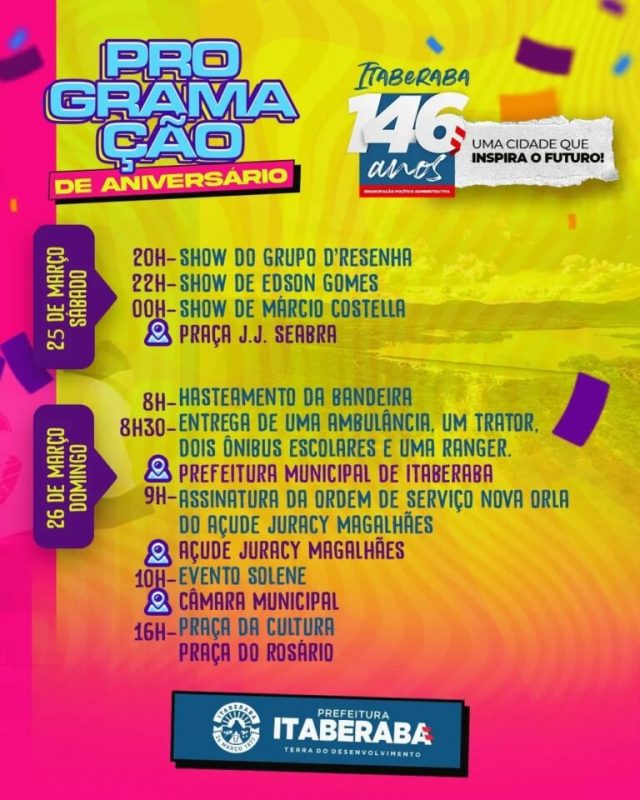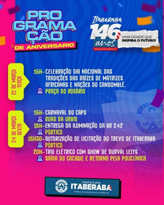 Nesta semana, Itaberaba completa 146 anos de emancipação política e administrativa. Para celebrar essa data especial, a prefeitura municipal divulgou um calendário de eventos que começa no dia 21 de março e segue até o dia 26, com uma variedade de atividades que vão desde inaugurações e entregas de equipamentos até shows de artistas locais renomados.