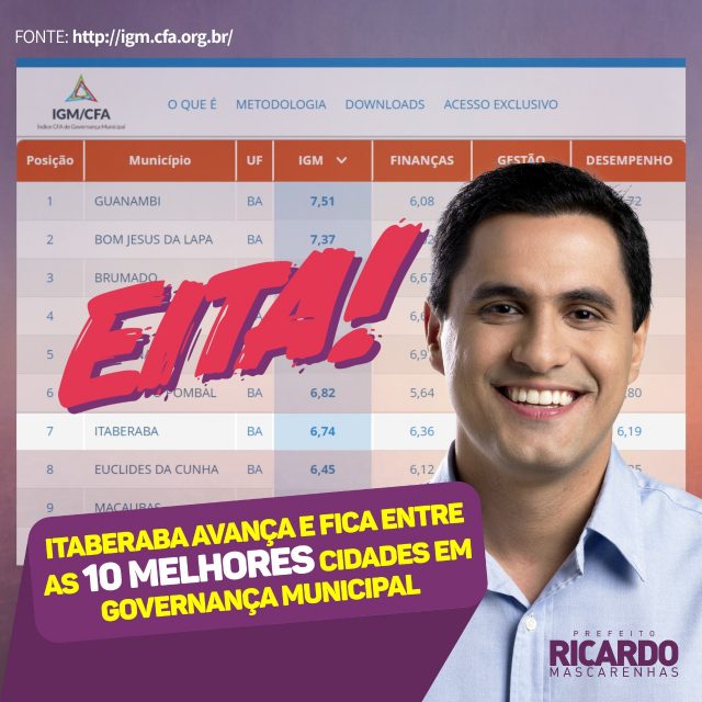 Ranking promovido pelo Tribunal de Contas Municipal e pelo CFA (Conselho Federal de Administração), o IGM mede o índice de governança municipal dos municípios de todo o Brasil, e imagine só, pela 1ª vez em 142 anos de história, Itaberaba ficou entre os 10 primeiros.