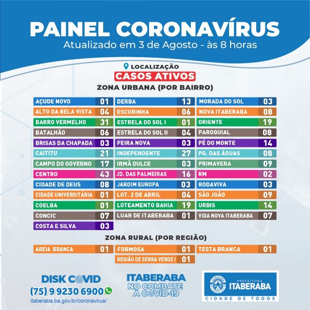 A Prefeitura de Itaberaba, por meio da Secretaria Municipal de Saúde (Sesau), assim como da Coordenação de Vigilância em Saúde e da Câmara Técnica (CT) de enfrentamento da pandemia do novo coronavírus, informa o Boletim Oficial 03/08 ㅡ com dados consolidados até as 17h de domingo (2) ㅡ que registrou 3 novos casos da COVID-19.