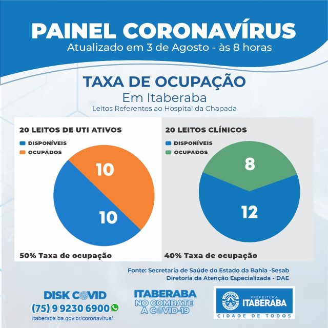 De acordo com o Boletim Oficial 03/08, até as 17h de domingo (2), os números da Taxa de Ocupação Leitos Clínicos e de Unidades de Terapia Intensiva (UTI) no município, com dados da Secretaria da Saúde do Estado da Bahia (Sesab), são os seguintes: dos 20 LEITOS DE UTI ATIVOS, 10 estão ocupados (50%); ao passo que, dos 20 LEITOS CLÍNICOS, 8 estão ocupados atualmente (40%). A taxa de ocupação geral é de 45%.
