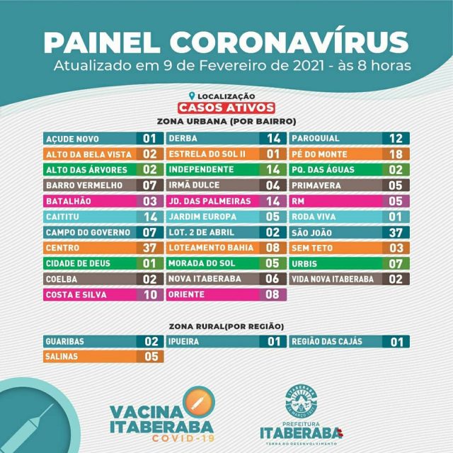 Itaberaba registrou 11 novos casos da COVID-19, nas ultimas 24 horas. A informação foi contabilizada, na manhã desta terça-feira (09) pela prefeitura, através da atualização do boletim epidemiológicos dos casos de coronavírus.