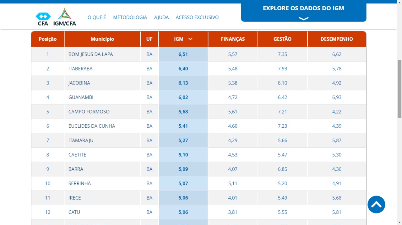 O Município de Itaberaba está em segundo lugar no ranking de avaliação da qualidade em Gestão Pública, é o que aponta um estudo do Conselho Federal de Administração (CFA).
