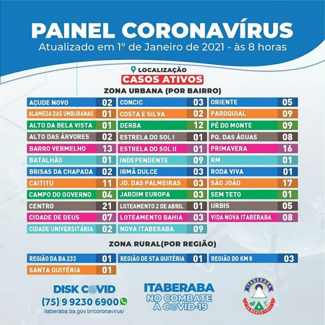 De acordo com o novo boletim epidemiológico dos casos de coronavírus, divulgado no início da manhã desta sexta-feira (01), pela prefeitura municipal de Itaberaba, a cidade tem 203 casos ativos da covid-19. são 27 novos casos registrados nas ultimas 24 hosras.